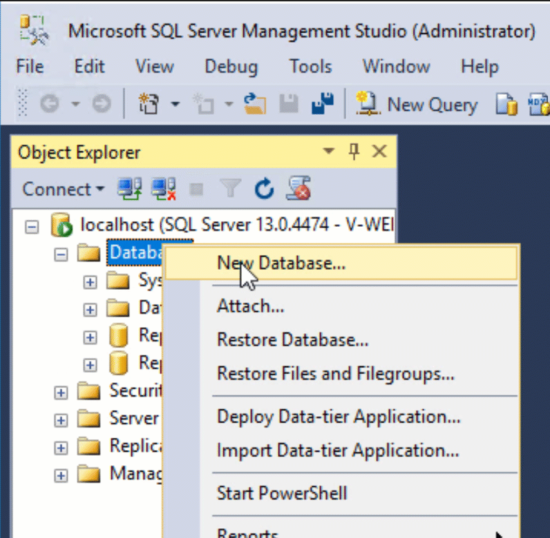 1. In SQL Server Management Studio, create a new database (see picture below). The New Database window appears.