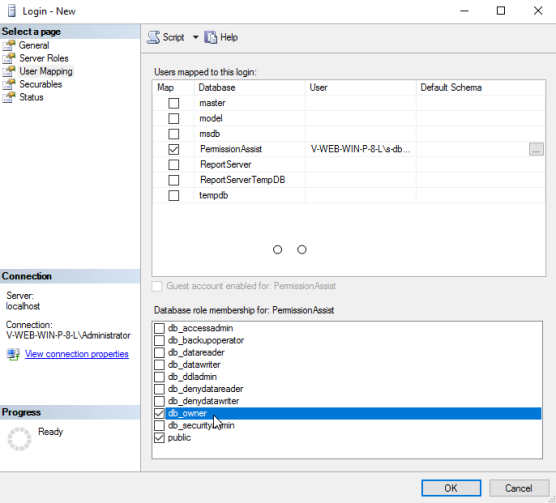 9. In the "Database role membership for: YourPermissionAssistDatabaseName" area, select db_owner and verify that Public is also selected (see picture below).