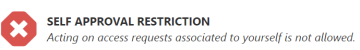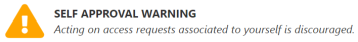 This option works in conjunction with the Can Approve Own Access Requests option. When this option is selected, anyone who is allowed to take action on access requests related to their own permissions will see the following warning message displayed in the Review Buttons area of the Remediations/Change Management Taskboard (see picture below).