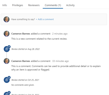 Comments on review items are saved with each review. To see the comments that were added in a previous review, complete the following steps: