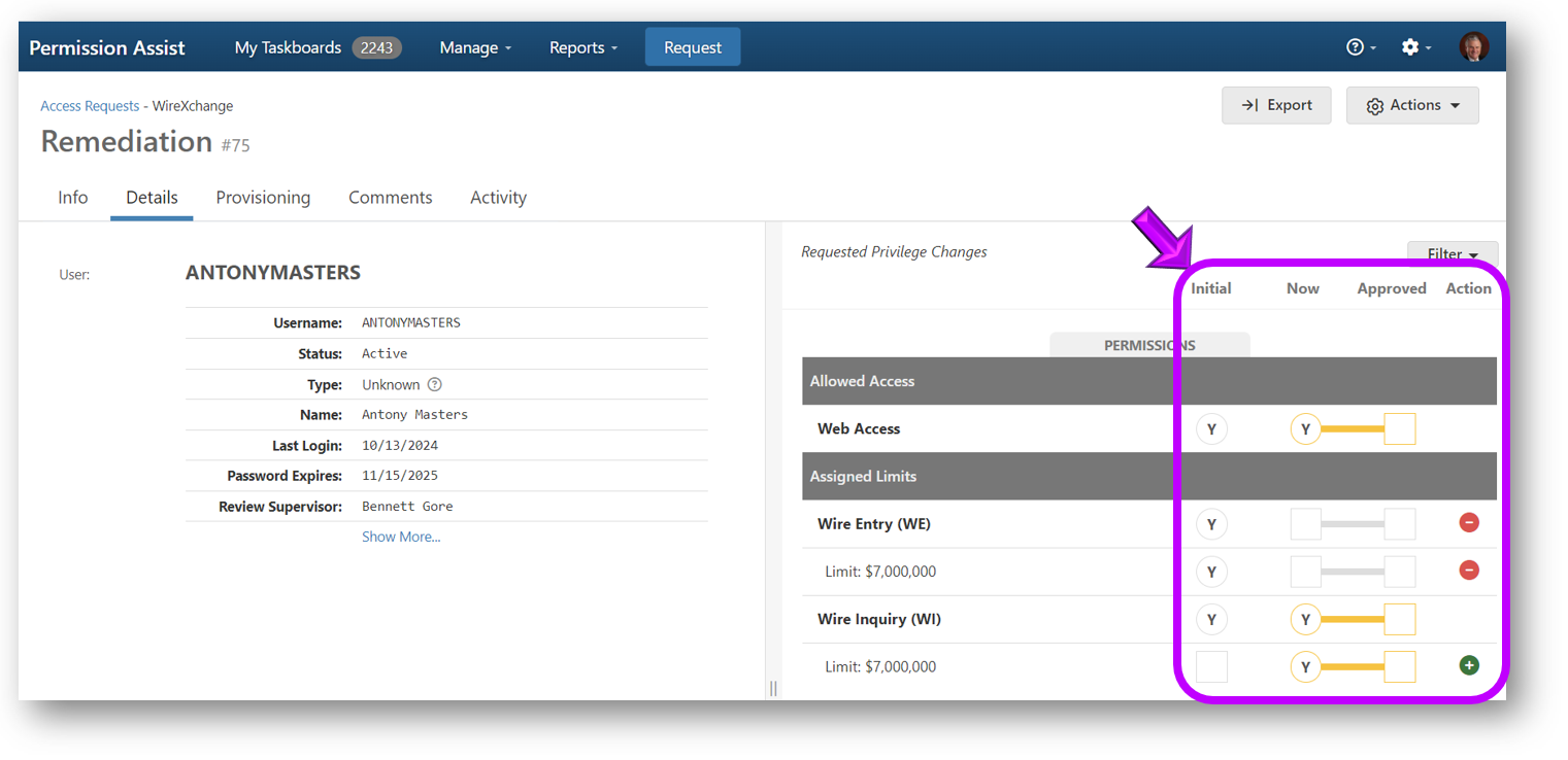 7. Compare the changes the reviewer requested (shown in the Action column within Permission Assist) with the current user's permissions in the application.