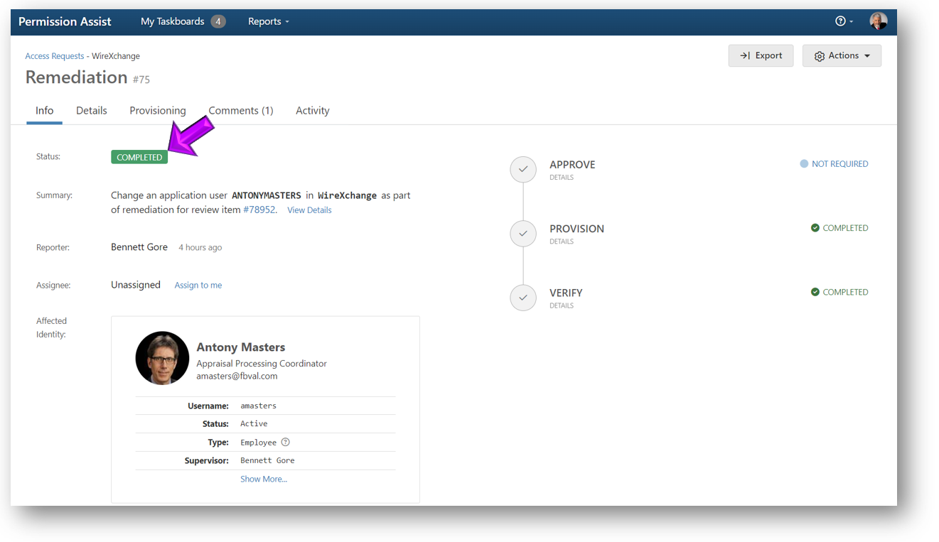 The status of the access request is changed to "Completed" (see picture below), and the status of the corresponding review item is changed to "Remediation Complete". At this point your work for this request is done – GREAT JOB!! Give yourself a high five!!