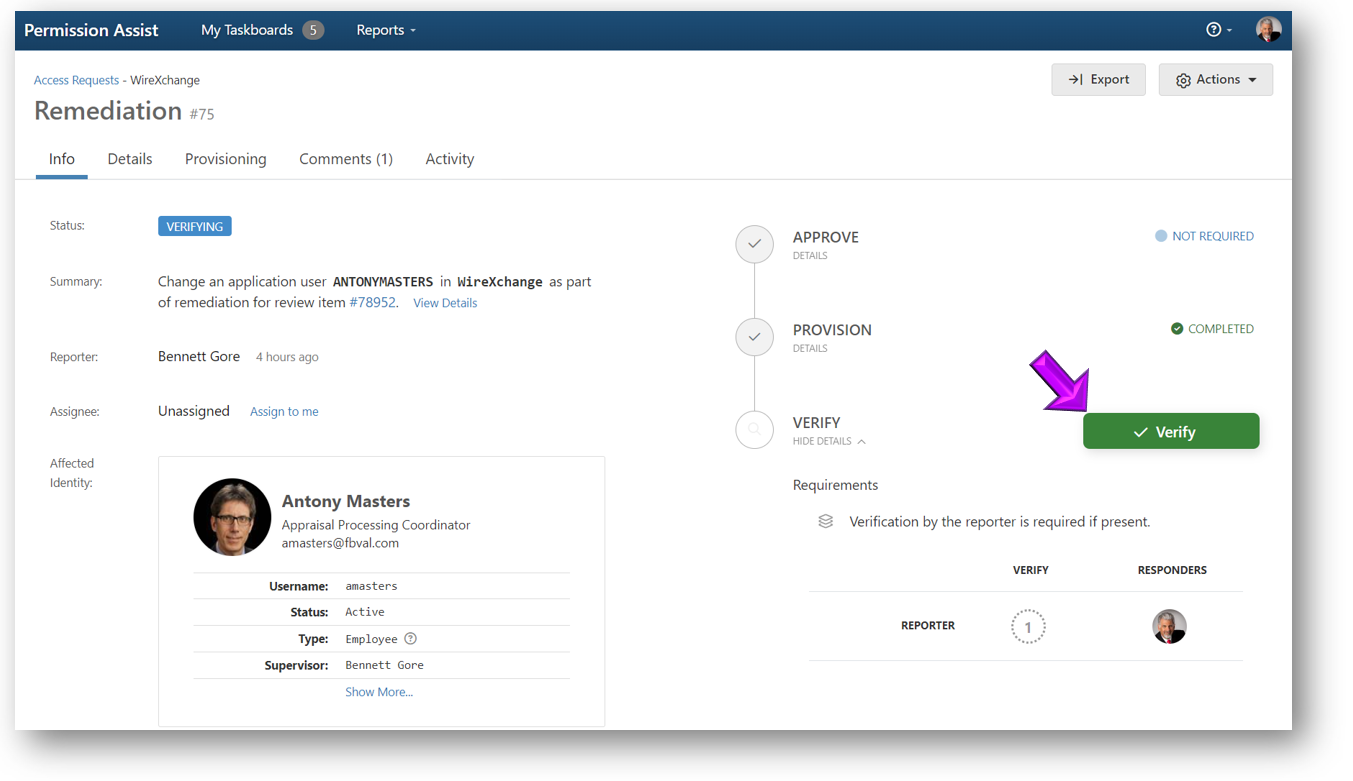 If your Permission Assist Administrators have set up a verification process for access requests, you many need to review and verify the changes after the Provision Engineers complete their work.