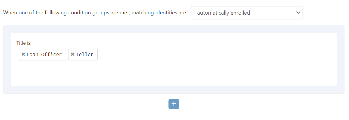Conditions Conditions are used to define who is automatically enrolled or who can be optionally enrolled in the access model. The Conditions area (see example below) displays the conditions that have already been added to the access model and allows you to add, change, or remove conditions.