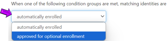 Option Description automatically enrolled By default, Identities will be automatically enrolled when the conditions are met. When this option is selected, identities will be added or removed from the access model based on whether the conditions of the access model are met. For example, if the conditions require that a person's job title be "Teller", then any identity with a job title of "Teller" will be automatically enrolled in the access model and removed if their job title is changed. approved for optional enrollment When this option is selected, Identities will not be automatically enrolled, but personnel managers are allowed to optionally enroll employees if the conditions of the access model are met. For example, if you have an access model called "Remote Employees" and the conditions of the access model make it available to any employees in the IT department, personnel managers are allowed to optionally enroll employees if they plan to work remotely and they work in the IT department. -