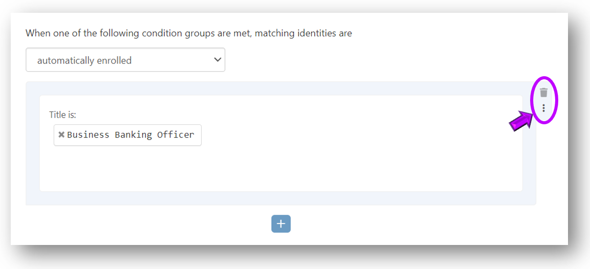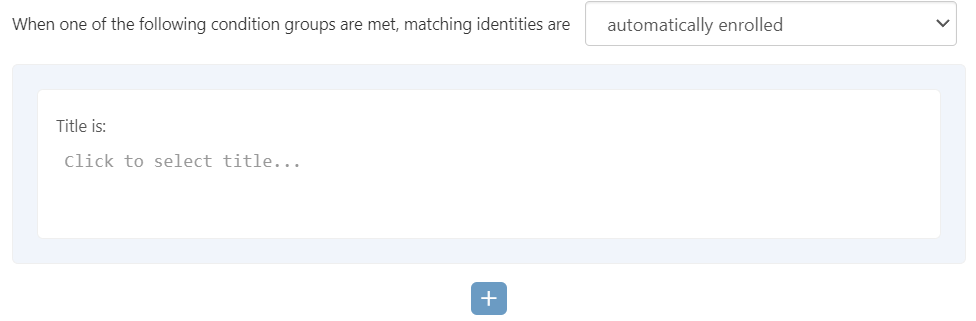 Select a condition option (Company, Division, Title, Department, etc). This will determine which conditions must be met for Identities to be enrolled. For example, if the "Title" option is selected, identities will be enrolled based on whether their job title matches one of the defined job titles.