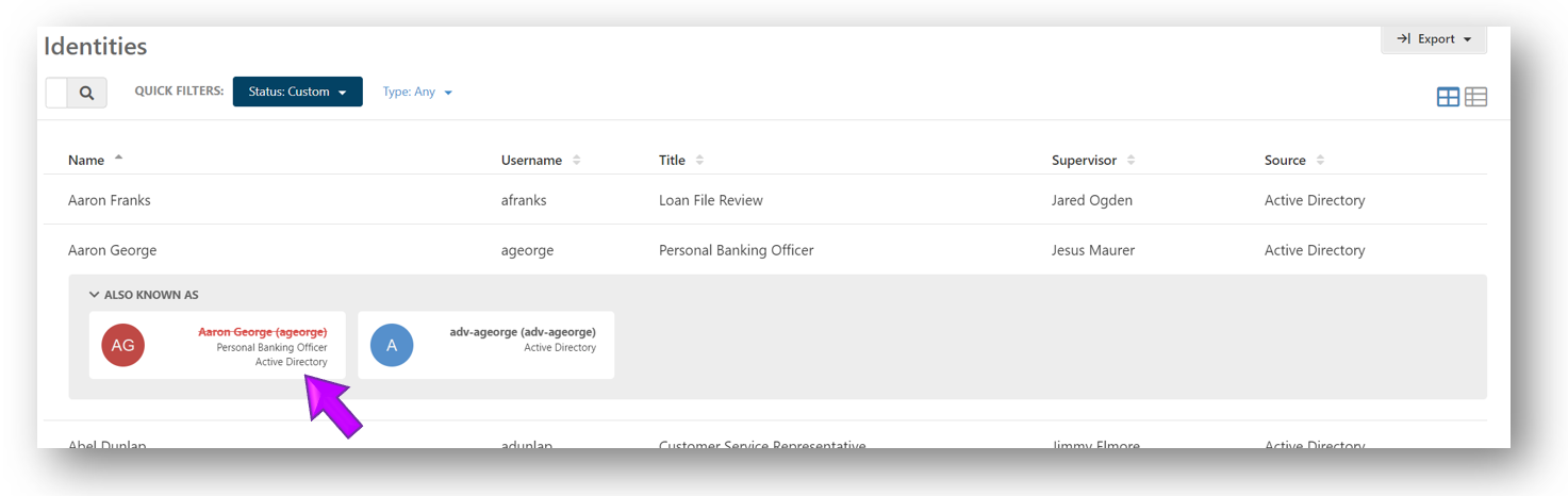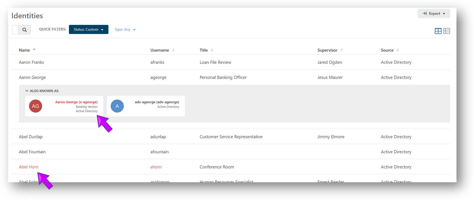• Removed - disabled Identities are displayed in red with a strikethrough (see examples below); these accounts have been removed from your primary directory source