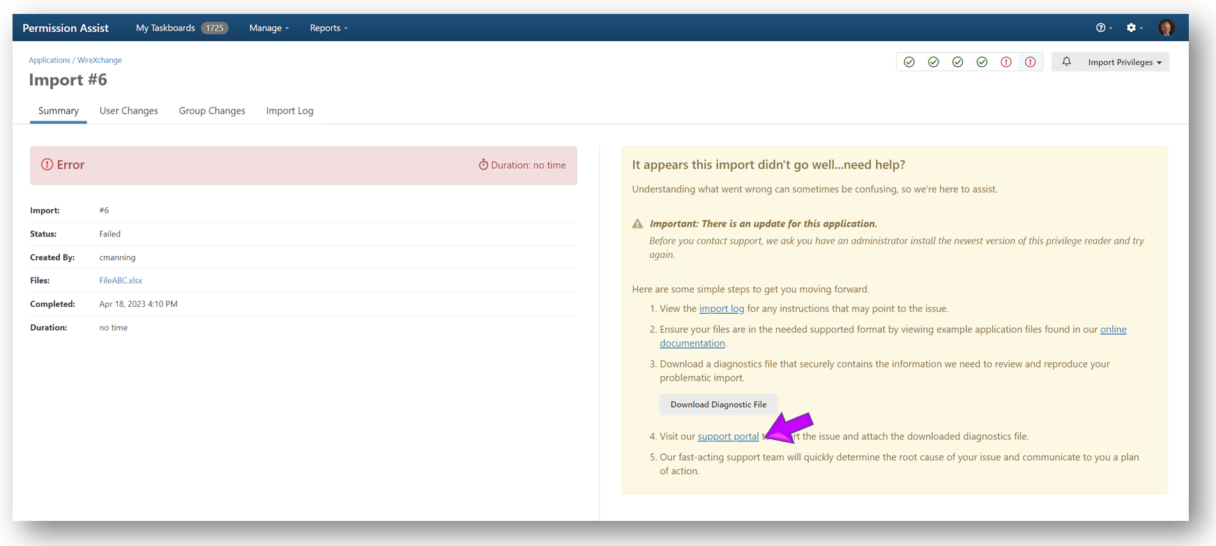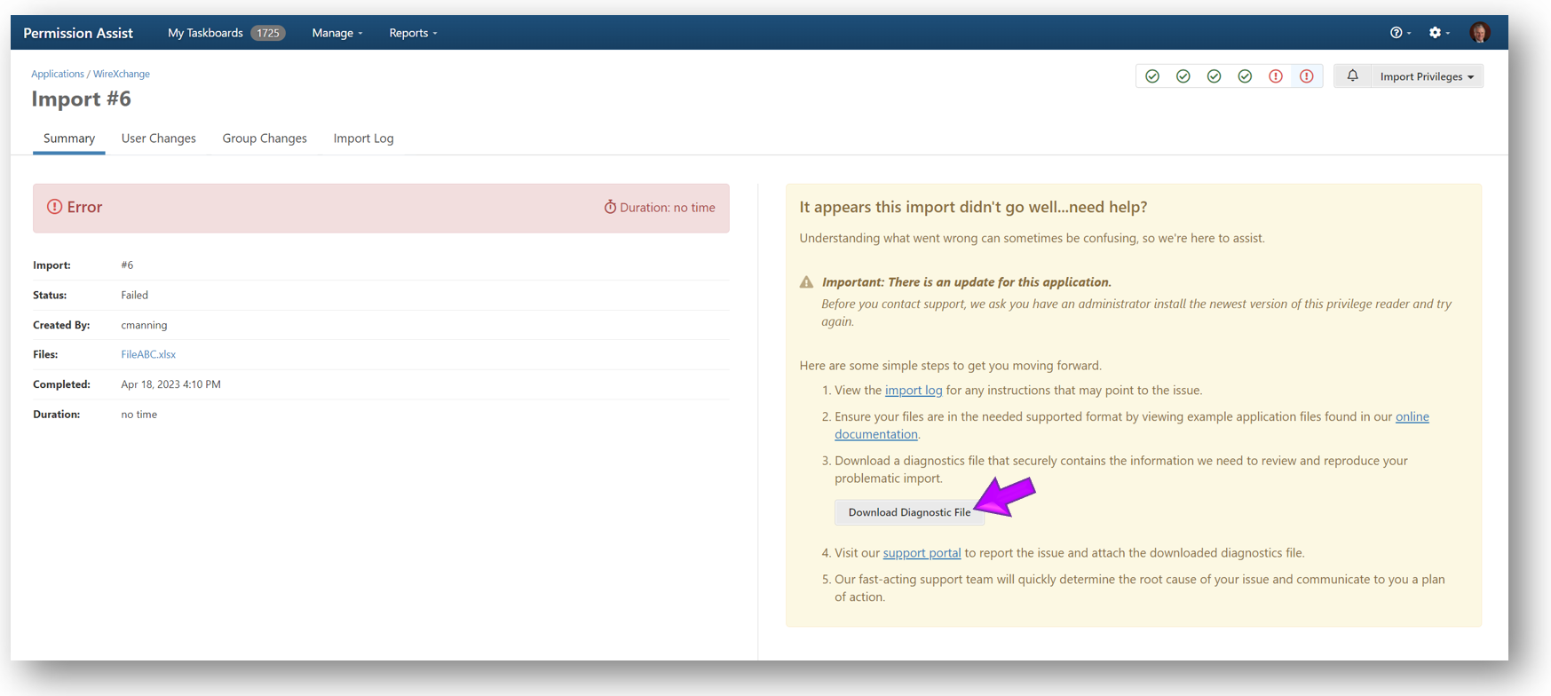 The following instructions walk you through the process of generating a diagnostic file for a failed import. If you need to generate a diagnostic file for a successful import, refer to the following topic: Generate a Diagnostic File for a Successful Import