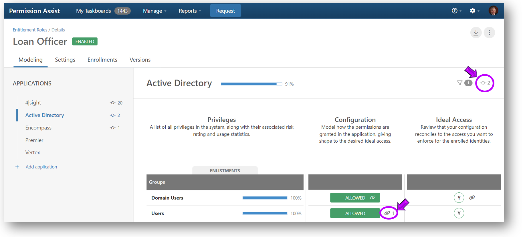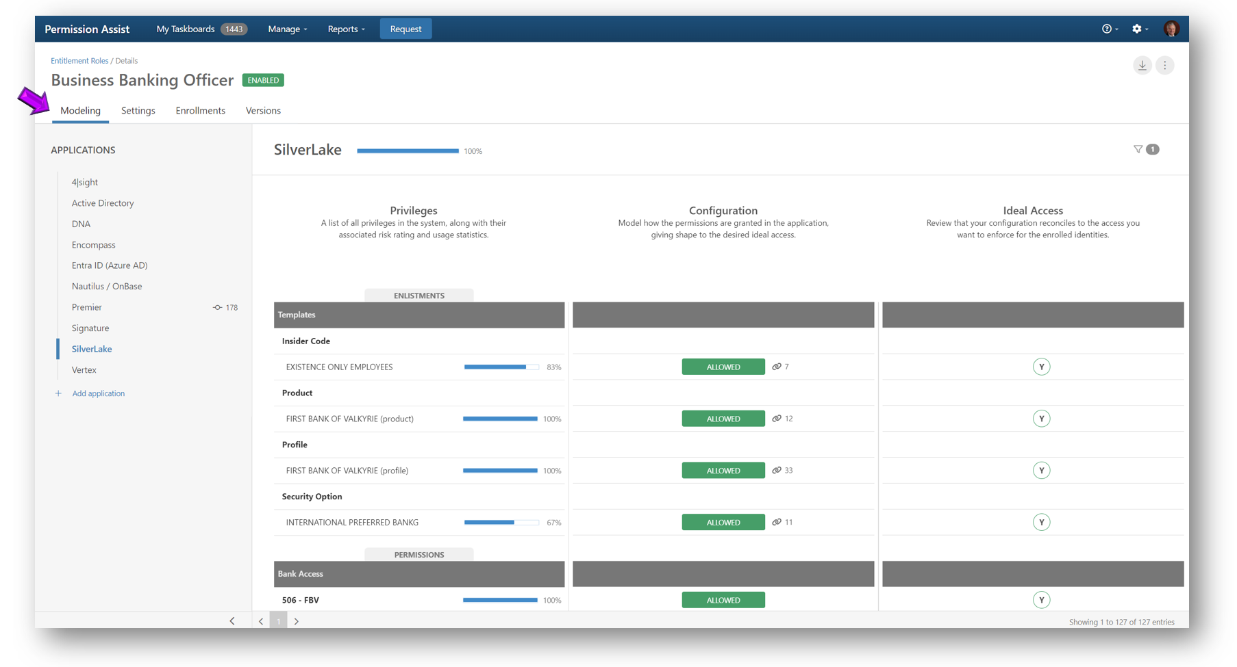 When selected, this option shows the permissions that have been granted through the modeling of ideal access. Permissions that have been configured will show as "Allowed" (see example below).